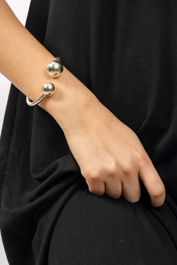O design aberto e ajustável torna essa peça extremamente confortável e prática, já que se adapta facilmente a diferentes tamanhos de pulso. Além disso, o estilo minimalista das esferas nas pontas transmite modernidade e delicadeza, sendo perfeito para quem gosta de composições discretas, mas cheias de personalidade.
